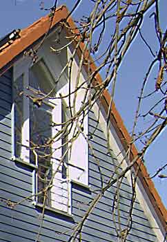Eine familiär wirkende Anlage wurde zwischen altem Baumbestand verwirklicht. Die Kleinmaßstäblichkeit findet sich in der Holzverschalung und den eingearbeiteten Gauben und Wintergärten wieder. |