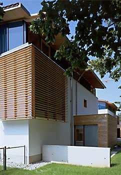 Die Anlage ist nach Süden zum Garten hin transparent geöffnet, zur Straße hin als Kontrast massiv ausgebildet. Im Wohnbereich wurde ein offenes Raumgefüge mit modernen Akzenten umgesetzt. |